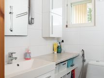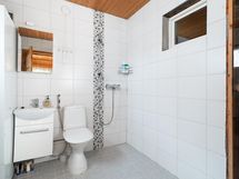 Kylpyhuone: wc-istuin, kylpyhuonekaapisto, suihku, peili. Rantasauna: wc-istuin, puusauna, suihku, pesukoneliitäntä, peili- ja allaskaappi