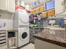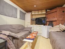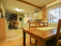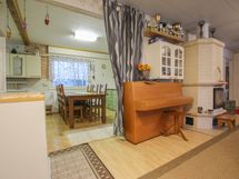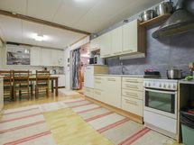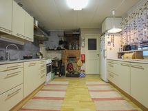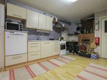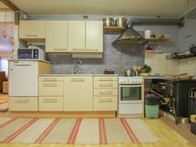 Liesi: keraaminen. Työtasot: laminaatti. Kylmäsäilytys: jääkaappi. Varustus: liesituuletin, astianpesukone. Leivinuuni, puuliesi