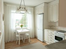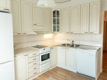 Liesi: keraaminen. Työtasot: laminaatti. Kylmäsäilytys: jääkaappi/pakastin. Varustus: liesituuletin.