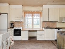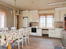 Keittiön varusteet: Jääkaappipakastin, uuni, liesi, liesituuletin ja astianpesukone. Liesi: Valurautaliesi. Työtason materiaali: Laminaatti.