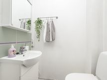 - Varusteet: Pesukoneliitäntä, Lattialämmitys, Suihku, Peilikaappi. Kylpyhuoneen lattialaatat ja seinäkaakelit maalattu. WC: WC-istuin, bidee-suihku, käsiallas, peilikaappi. Lattialämmitys.