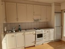 Suuri tiskipöytä, Tilaa isolle ruokapöydälle, Paljon kaappitilaa, Astianpesukone, Jää-pakastinkaappi, Sähköliesi, Liesituuletin