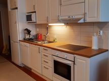 - Tilaa isolle ruokapöydälle, Paljon kaappitilaa, Paljon työskentelytilaa, Suuri tiskipöytä, Puutasot, Astianpesukone, Integroidut koneet, Liesituuletin, Liesi tai uuni erikseen, Jääkaappi-pakastin, Induktioliesi.