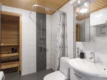 - Pesutilojen varusteet: WC-istuin, suihku, pesukoneliitäntä, peilikaappi ja bidee-suihku.