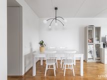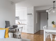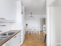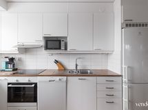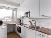 - Keittiön varusteet: Jääkaappipakastin, astianpesukone, uuni, liesi ja liesituuletin. Työtason materiaali: Puu.