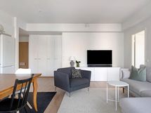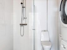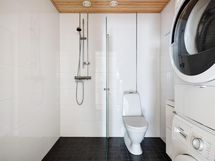 - Kylpyhuone/WC, suihku ja -seinä, allaskaappi, valollinen peilikaappi, käsisuihku, pesukoneliitäntä, kattovalaisin, lattialämmitys