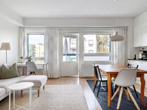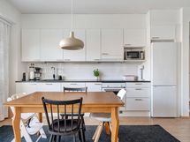 - Kaapistot, jääkaappi/pakastin, erillisuuni- ja induktiotaso, astianpesukone, liesituuletin, välitaso laattaa, valaisimet, tasot laminaattia