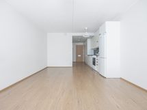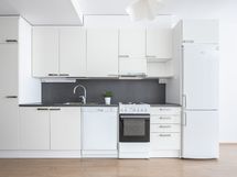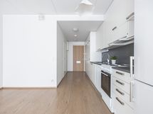 - Keittiötila, jossa kaapistot, liesi, astianpesukone ja jääkaappi-/pakastin.