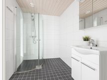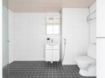 - Pesutilojen kuvaus: Suihku, kääntyvät suihkuseinät, allas, allaskaappi, peilikaappi, korkea kaappi, wc-istuin, pesukoneliitäntä ja rättipatteri. Lattiassa sähköinen lattialämmitys.