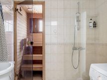 - Kylpyhuone, suihku, peilikaappi, pesukoneliitäntä, erillinen wc, sähkösauna