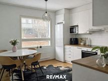- Keittiön varusteet: Jääkaappipakastin, liesi, uuni ja liesituuletin. Liesi: Keraaminen liesi. Työtason materiaali: Laminaatti.