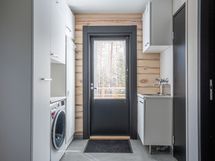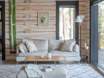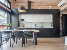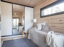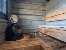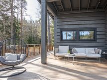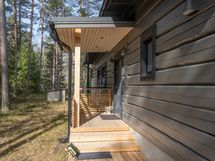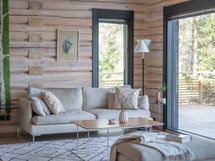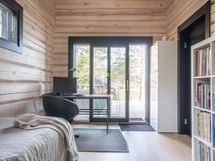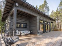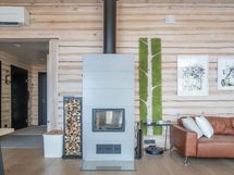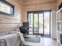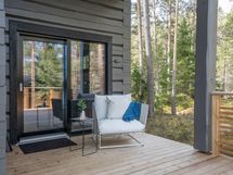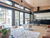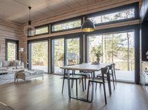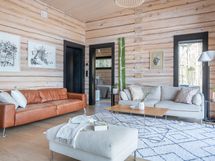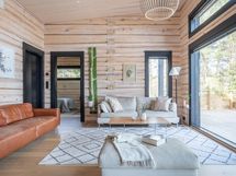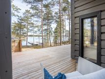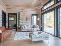The stylish log house offers a beautiful view of the sea and the large windows allow you to get close to nature. Sliding glass doors in the living room and bedroom lead to a huge terrace that runs the entire width of the house. The kitchen and living room form a spacious area, where a warming fireplace provides atmosphere. Hardwood floors and materials chosen by the interior designer create a peaceful background for the interior. The light log walls are beautiful and natural. The sauna has a ready-to-use heater and a magnificent panoramic window overlooking the sea. The spacious utility room, which serves as the sauna department's dressing room, also leads to the terrace to cool off.