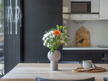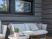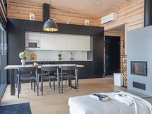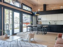 A squirrel is skittering on the terrace, a pair of silkmoths are diving in the water and little birds are flocking on the bird board. Here at Taalintehdas on the island of Långö, nature is close by and the soul rests while admiring the beautiful seascape. The modern villa, built in 2023 from sturdy hand-carved logs and suitable for year-round living, sits in place as if it had always been there.