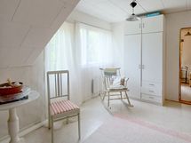Huset har ett väldigt trevlig bottenplan, rymligt och med kök, stort vardagsrum, badrum/wc och kallveranda på nedervåningen. I övre våning finns det 3 rum och en stor aula vid trappuppgången, samt en liten balkong. Ett av övervåningens rum är halvfärdigt. Huset har en storlek på ca 110 m2.
