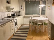 - Tilaa isolle ruokapöydälle, Paljon kaappitilaa, Paljon työskentelytilaa, Suuri tiskipöytä, Laminaattitasot, Astianpesukone, Pesukoneliitos, Sähköliesi, Liesituuletin, Jääkaappi, Viileäkaappi, Pakastin, Jää-viileäkaappi, Jää-pakastinkaappi