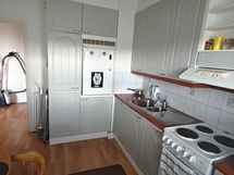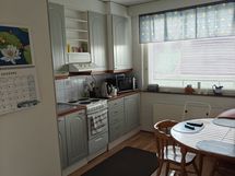 Tilaa isolle ruokapöydälle, Paljon työskentelytilaa, Paljon kaappitilaa, Laminaattitasot, Sähköliesi, Jää-pakastinkaappi