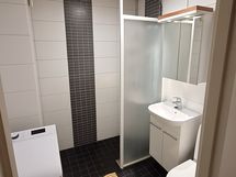 Suihku, Suihkuseinä, Pesukonevalmius, Peilikaappi, Allaskaappi, Laattalattia, Halogeenivalot, Laattaseinä, Lattialämmitys
