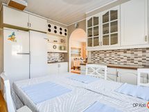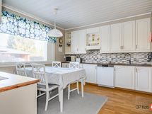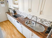 - Jääkaappi, pakastekaappi, erillisuuni, keraaminen liesi, liesituuletin, mikroaaltouuni, astianpesukone, kaapistot, kiinteät valaisimet.