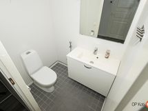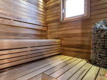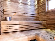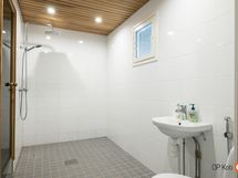 Sauna, sähkökiuas, kylpyhuone, erillinen wc, suihku, suihkukaappi, suihkuseinä (laajennusosalla), peilit, peilikaappi, kaapit, allaskaappi, pesukoneliitäntä (kodinhoitohuoneessa), lattialämmitys, kiinteät valaisimet.