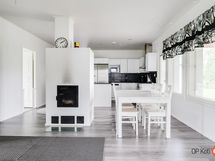 Alkuperäisen osan sydän, tupakeittiö, kutsuu perheen yhteisiin hetkiin varaavan takan luoman tunnelman äärelle. Tilavat makuuhuoneet, näppärä saunaosasto sekä iso erillinen kodinhoitohuone vastaavat erinomaisesti perustarpeisiin. Laajennuksessa puolestaan tehtiin kahden makuuhuoneen, kylpyhuoneen sekä valoisan oleskelutilan muodostama kokonaisuus. Olohuoneessa on varaus myös pienen keittiön rakentamiseen.