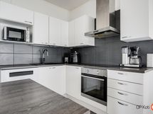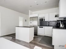 Jääkaappipakastin, erillisuuni, liesitaso, induktioliesi, liesituuletin, astianpesukone (2025), kaapistot (Puustelli), kiinteät valaisimet.