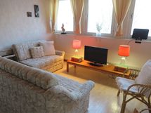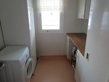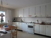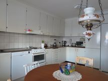 Keittiön varusteet: Jääkaappipakastin, liesi, liesituuletin ja astianpesukone. Liesi: Sähköhella. Työtason materiaali: Laminaatti.