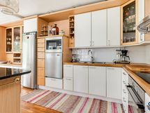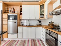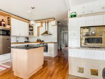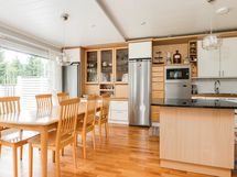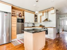 - Keittiön varusteet: Mikroaaltouuni, astianpesukone, keittiösaareke (saarekkeessa kivitaso), jääkaappi, jääkaappipakastin ja leivin uuni. Liesi: Induktioliesi. Työtason materiaali: Puu.