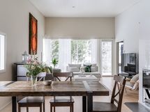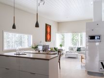 Yksitasoinen pohjaratkaisu tekee arjesta sujuvaa ja vesikiertoinen lattialämmitys kaukolämmöllä takaa miellyttävän lämmön kauttaaltaan.