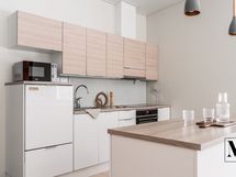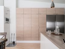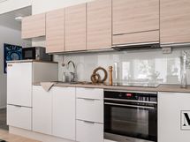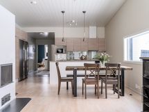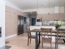 Keittiö on tilava ja käytännöllinen, runsaat säilytystilat ja saareke tuovat työskentelyyn mukavuutta ja leivinuuni tuo tunnelmaa ja monipuolistaa ruoanlaittoa. Keittiön yhteydessä oleva ruokailutilaan sopii reilun kokoinen ruokailuryhmä.