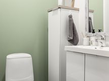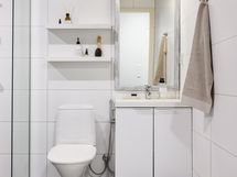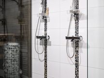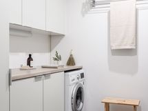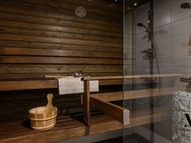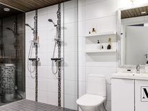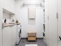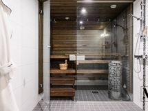 Moderni sauna ja tilava kylpyhuone jossa on kaksi suihkua ja lasiseinät jotka luovat avaran tunnelman. Saunan korkea pilarikiuas takaa miellyttävät löylyt. Oma kodinhoitohuone jossa on hyvin säilytystilaa ja pyykkihuolto toimii jouhevasti omassa tilassaan.