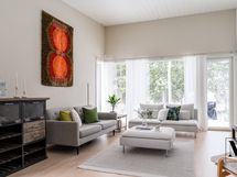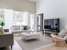 Olohuone hurmaa korkealla huonekorkeudellaan ja avaralla, yhtenäisellä tilalla. Selkeä pohjaratkaisu tekee sisustamisesta helppoa ja Uuniseppien varaava takka tuo lämpöä ja viihtyisyyttä kokonaisuuteen. Olohuoneesta on käynti tilavalle takaterassille, jonka yhteydessä on myös varastotilaa.