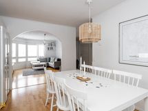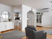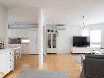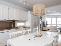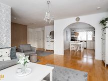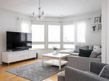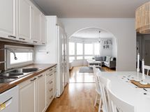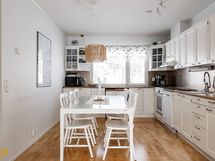 - Keittiön varusteet: Jääkaappi, erillinen pakastin, uuni ja liesituuletin. Liesi: Keraaminen liesi. Työtason materiaali: Laminaatti.