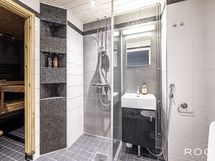 - Pesutilojen kuvaus: Varustus: Wc-istuin, bidee-suihku, lavuaari, suihku, lattialämmitys.