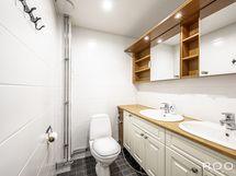Lattia: Laatoitettu. Erillisen WC:n kuvaus: Varustus: wc-istuin, bidee-suihku, 2x lavuaari, peilikaapit, lattialämmitys.