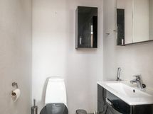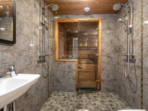 Lattialämmitys (sähkö), pesuallas, peili, led-valaistus, wc-istuin, 2 sadesuihkua. Lattia ja seinät laattaa. Erillisten WC:n lukumäärä: 2. Erillisen WC:n varusteet: WC-istuin, peilikaappi, pesuallas, bidee-suihku ja allaskaappi.