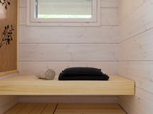 - Kiuas: Sähkökiuas. Kiuas on Tulikiven Kuura 1 -malli. Seinällä käsityönä tehty Jakarandapuu valopaneli. Lauteet ja seinät hirsi.