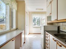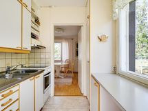 Jääkaappi, keraaminen liesi, liesituuletin, kaapistot. Ikkunat kahteen suuntaan.