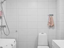 - Kylpyhuone, suihku, suihkuseinä, peilikaappi, kaapit, allaskaappi, pesukoneliitäntä, lattialämmitys, kiinteät valaisimet.