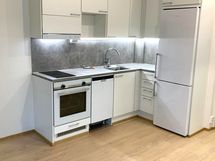- Keittiön varusteet: Jääkaappipakastin, erillisuuni, liesi, astianpesukone ja liesituuletin. Liesi: Induktioliesi. Työtason materiaali: Laminaatti.