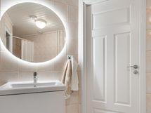 - Sauna, sähkökiuas, suihku, suihkuverhontanko, valopeili- ja allas ja allaskaappi, pesukoneliitäntä, korkea kaappi ja lattialämmitys (sähköinen), wc-istuin.