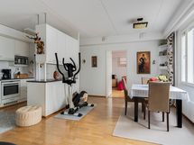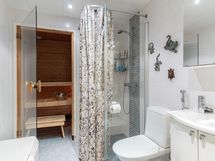 - Kylpyhuone, suihku, peilikaappi, pesukoneliitäntä, lattialämmitys, kiinteät valaisimet, sähkösauna
