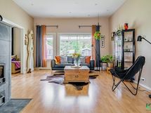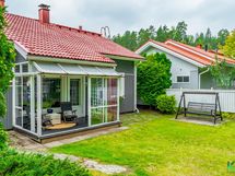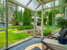 Olohuoneen yhteydessä oleva lasitettu terassi toimii viihtyisänä lisähuoneena ja oleskelutilana aina keväästä pitkälle syksyyn.