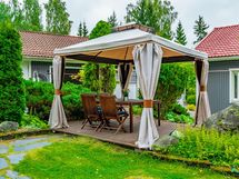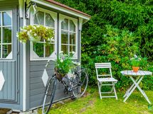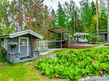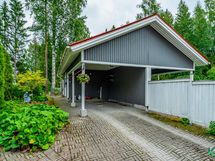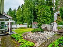 Hyvin hoidetulla pihalla on monivuotisia istutuksia, huvimaja, grillikatos ja leikkimökki. Suojaisa piha sopii myös perheen lemmikille. Autokatokseen saat auton säältä suojaan. Autokatoksen yhteydessä on tilava varasto.