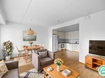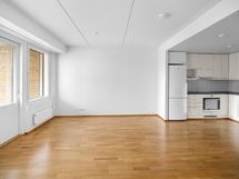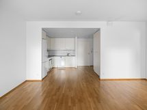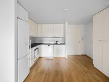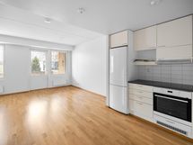 - Valkoiset kaapistot, jääkaappi/pakastin, astianpesukone, keraaminen liesi, kiertoilmauuni, liesituuletin filtterillä. Parkettilattia, seinät maalattu.