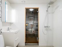 - Pesutilojen varusteet: WC-istuin, suihku (sadesuihku), suihkuseinä, pesukoneliitäntä, peilikaappi, pesuallas, allaskaappi, bidee-suihku, rättipatteri (vesikiertoinen) ja lattialämmitys (sähköinen).