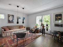 - Kylpyhuone, suihkuseinä, pesukoneliitäntä, lattialämmitys, sauna, pyyhekuivain. Lattia ja seinät laatoitettu (maalattu). Erillinen wc