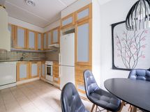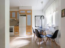 - Keittiön varusteet: Jääkaappipakastin, liesituuletin, astianpesukone ja uuni. Liesi: Keraaminen liesi. Työtason materiaali: Laminaatti.