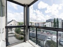 Toisen kerroksen saunallinen kaksio, jossa lasitettu parveke.
