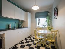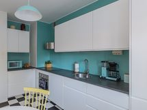 - Työtason materiaali: Laminaatti. Kaapistot, tasot, integroitu jääkaappi/pakastin, induktio liesitaso, erillisuuni, liesituuletin, integroitu astianpesukone. Välitila: Maali.