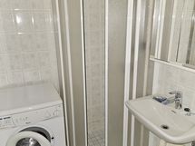 Hyväkuntoinen ja raikkaalla vaaleanvihreällä/vaalealla laatoitettu kylpyhuone/wc-tila, jossa wc:n lisäksi erillinen suihkukaappi, käsienpesuallas ja peilikaappi sekä pyykinpesukoneliitäntä.